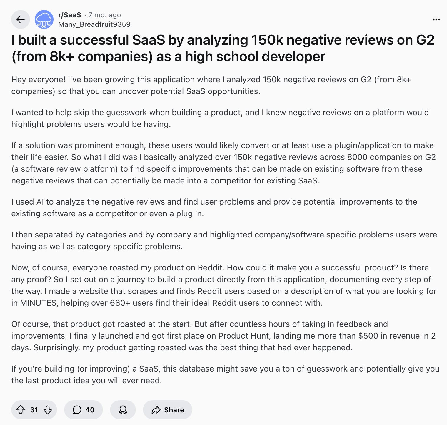 This founder on Reddit even analyzed 150k negative reviews across 8,000 SaaS companies to find opportunities. (Source)
