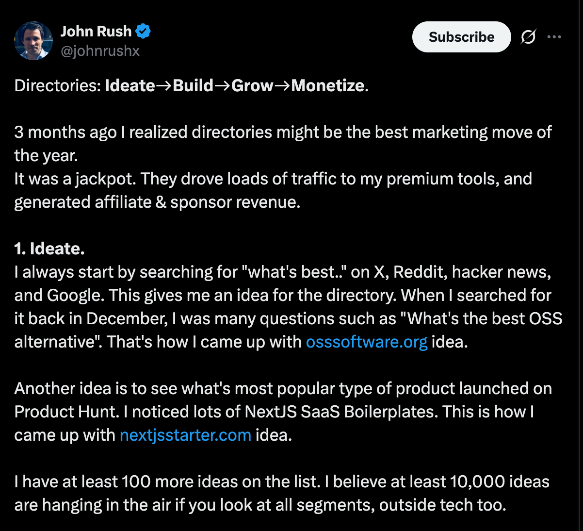 John Rush’s insight: don’t just get listed - build directories yourself. He launched 20+ directories, with 5 of them becoming the go-to resources in their niches.