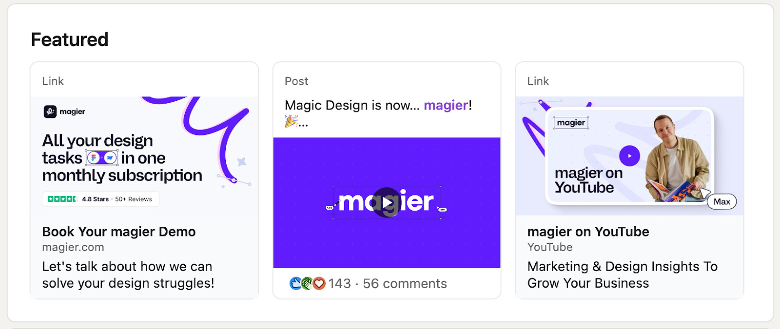 A library of “ready” posts, including copy and visuals, designed in the company branding. Case Studies, carousels, lead magnets, upcoming company announcements, etc. Posts anyone could post, regardless of role.