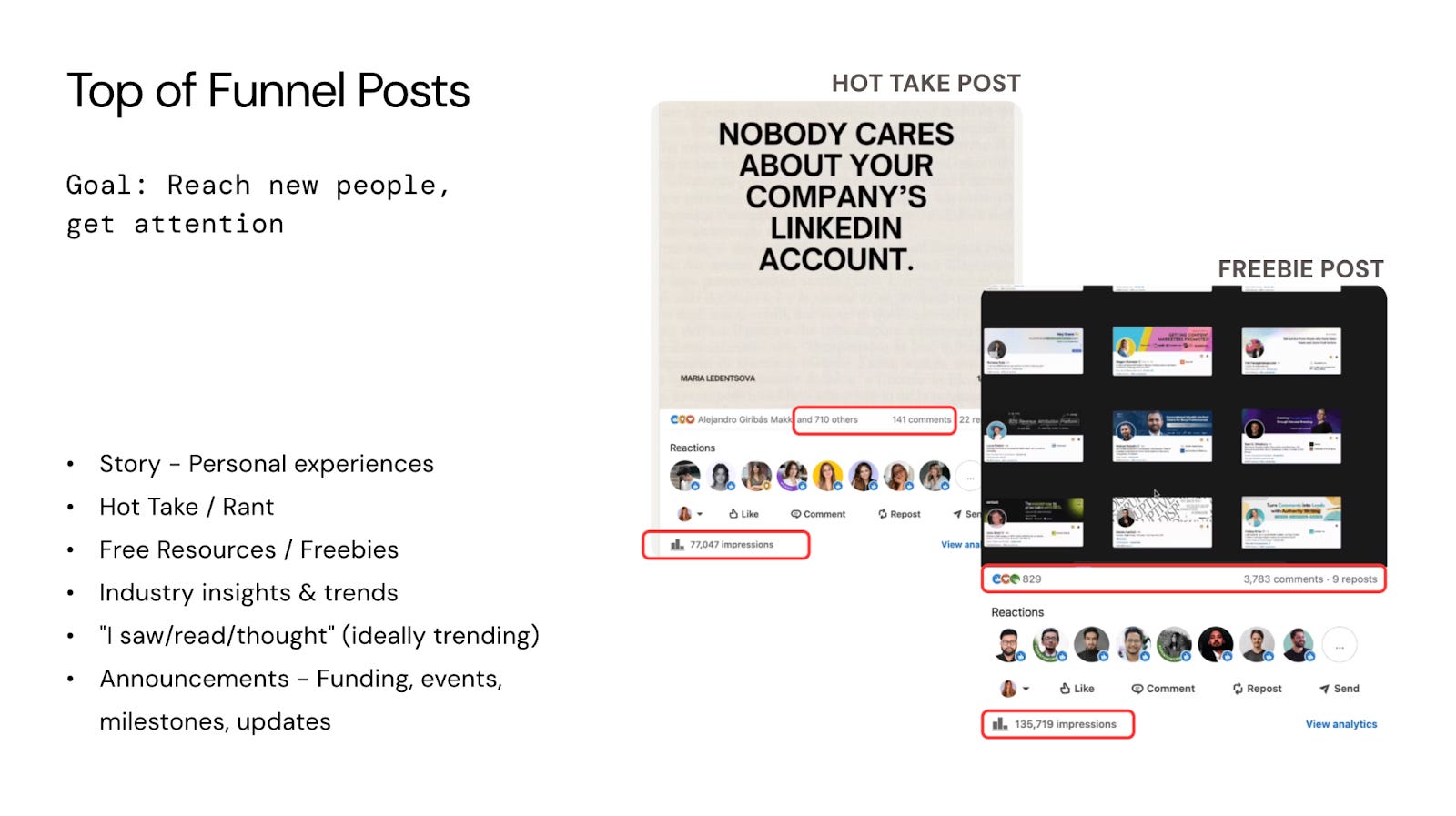 The most effective way to make LinkedIn a relevant growth channel for you is by writing content that serves all 3 stages of the marketing funnel - from first discovering your brand to becoming a customer.