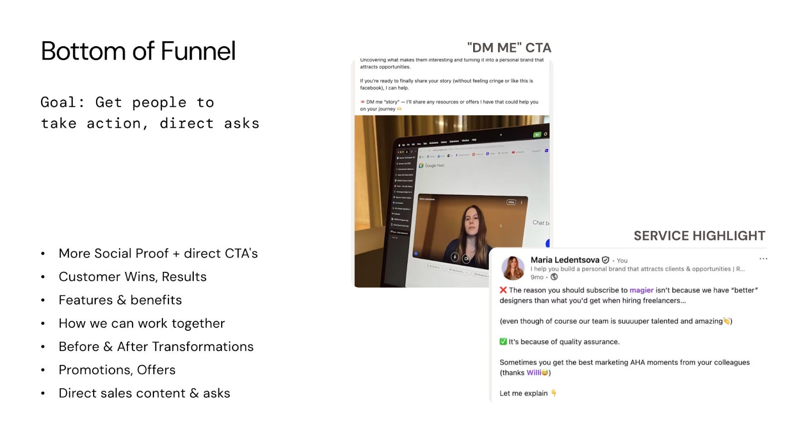 People are ready to make a decision. They need proof that you deliver results and clear calls to action. Content here should showcase outcomes, social proof, and clear next steps to work with you.