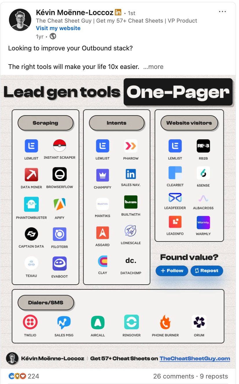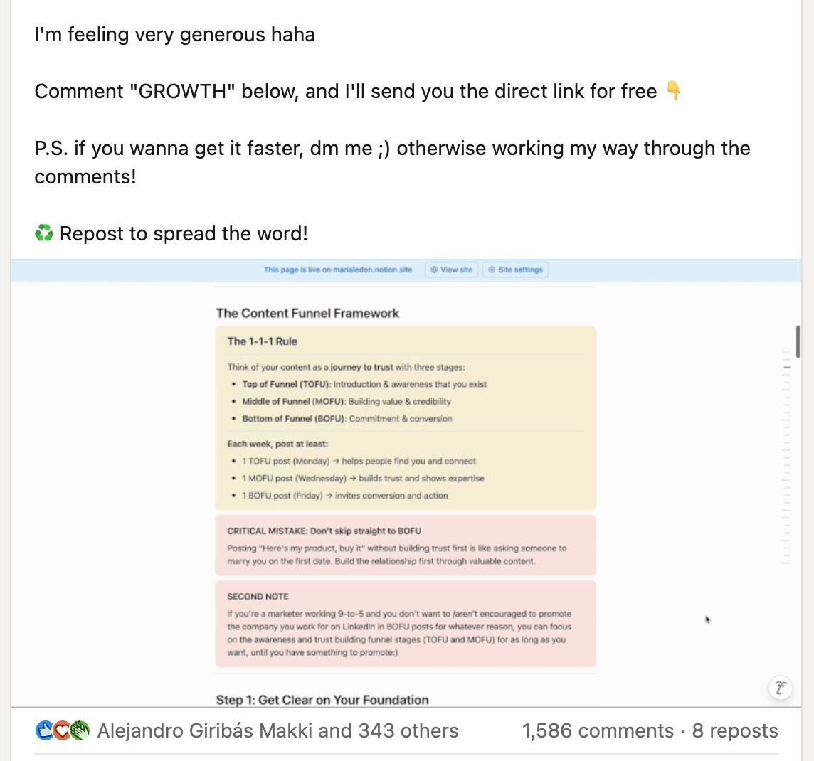 Some people hate it. But it works 😀 You share highly relevant content on LinkedIn. And ask people to comment to get the asset. And you will send a DM to everyone who commented.
