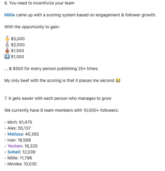 Consider creating an internal leaderboard to track impressions, engagement, and follower growth.