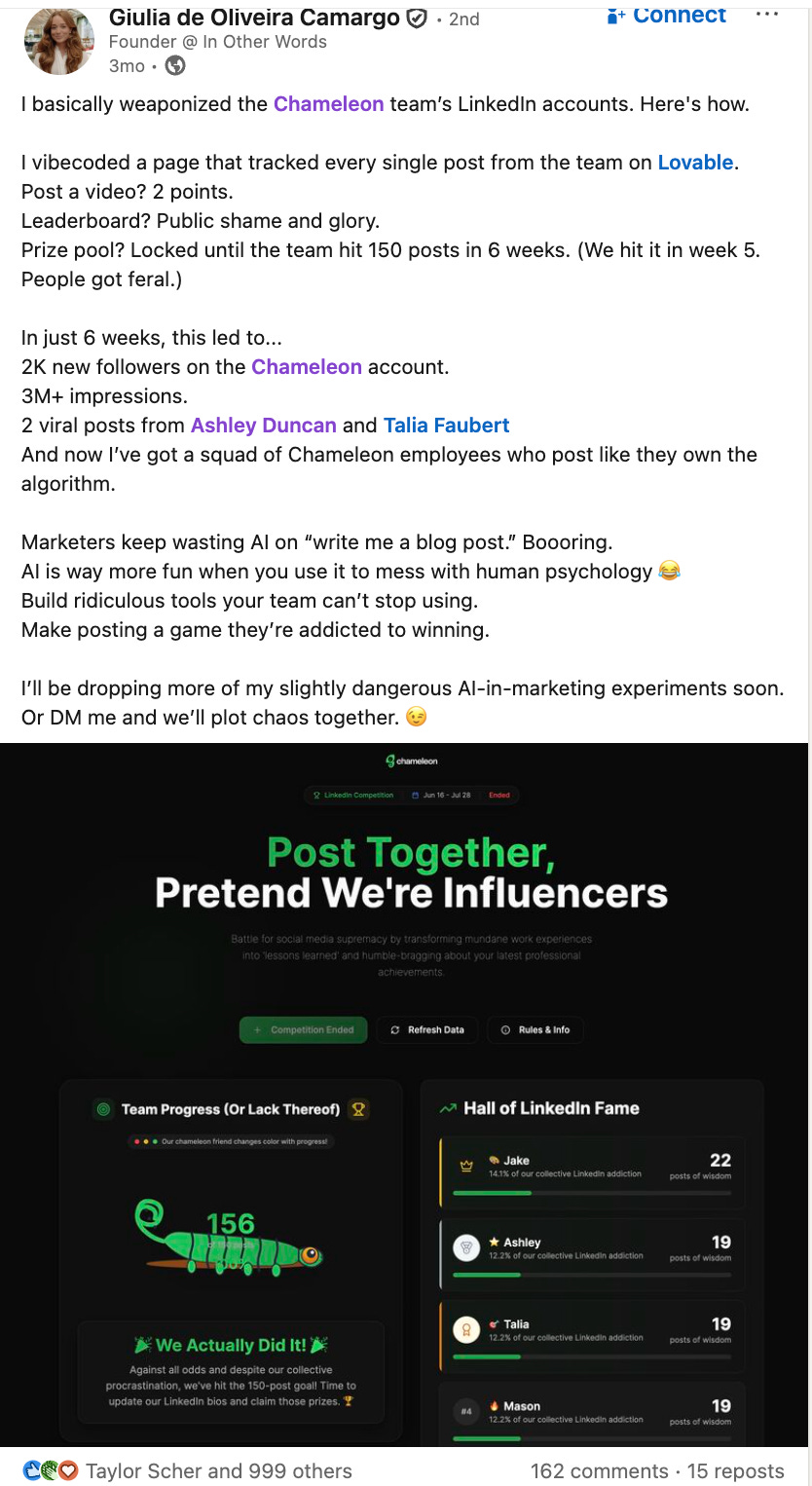 Giulia from Chameleon even built a dashboard in Lovable to track employee post amounts and motivate people to post more (or you can use SocialKit)