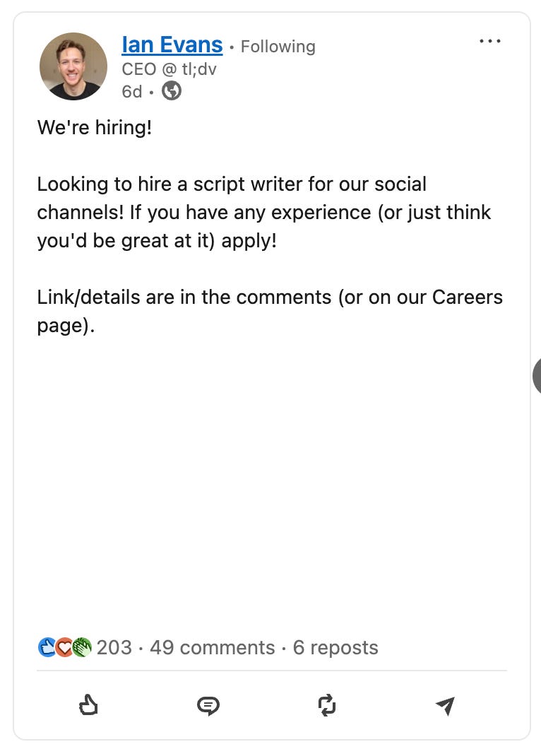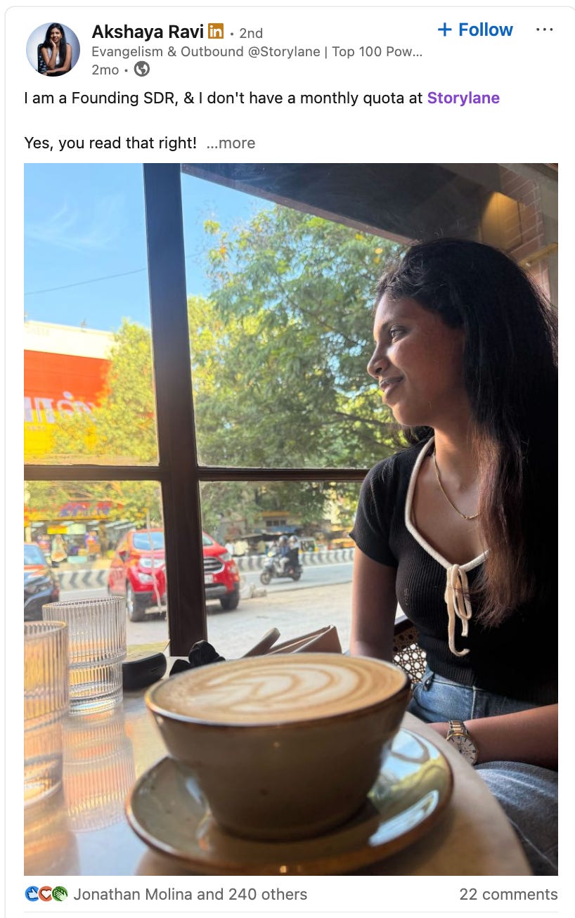 For example, at every all-hands, Storylane thanks employees who post on LinkedIn and ends with a call to action encouraging others to share.