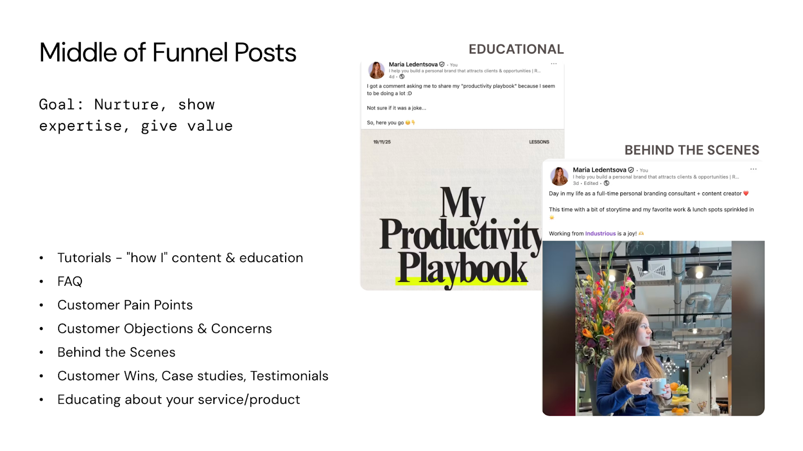 Practical advice: Aim to post at least 1x TOFU, 1x MOFU, and 1x BOFU post per week.
