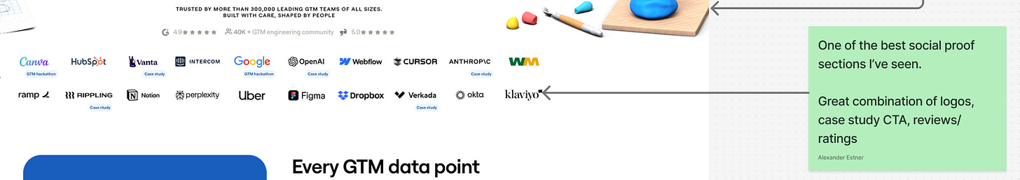 We saw several strong approaches to social proof, far beyond simple logo carousels.