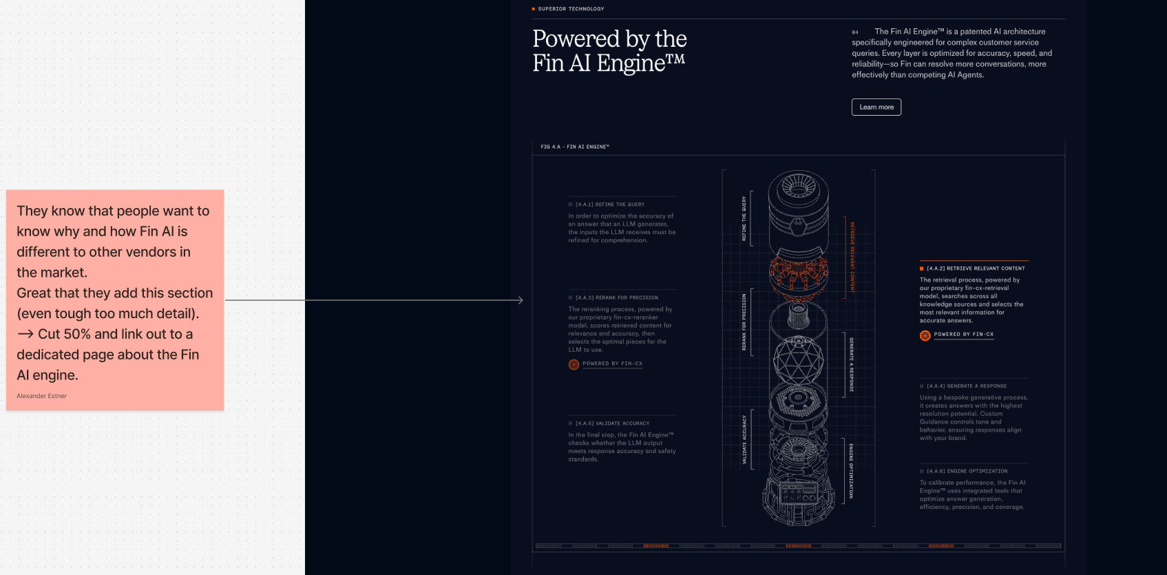 👉 Solution: Cut ~50% and move the depth to a dedicated page (e.g. “How the Fin AI engine works”).