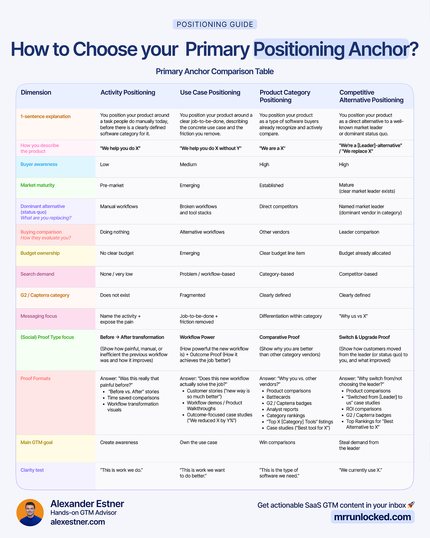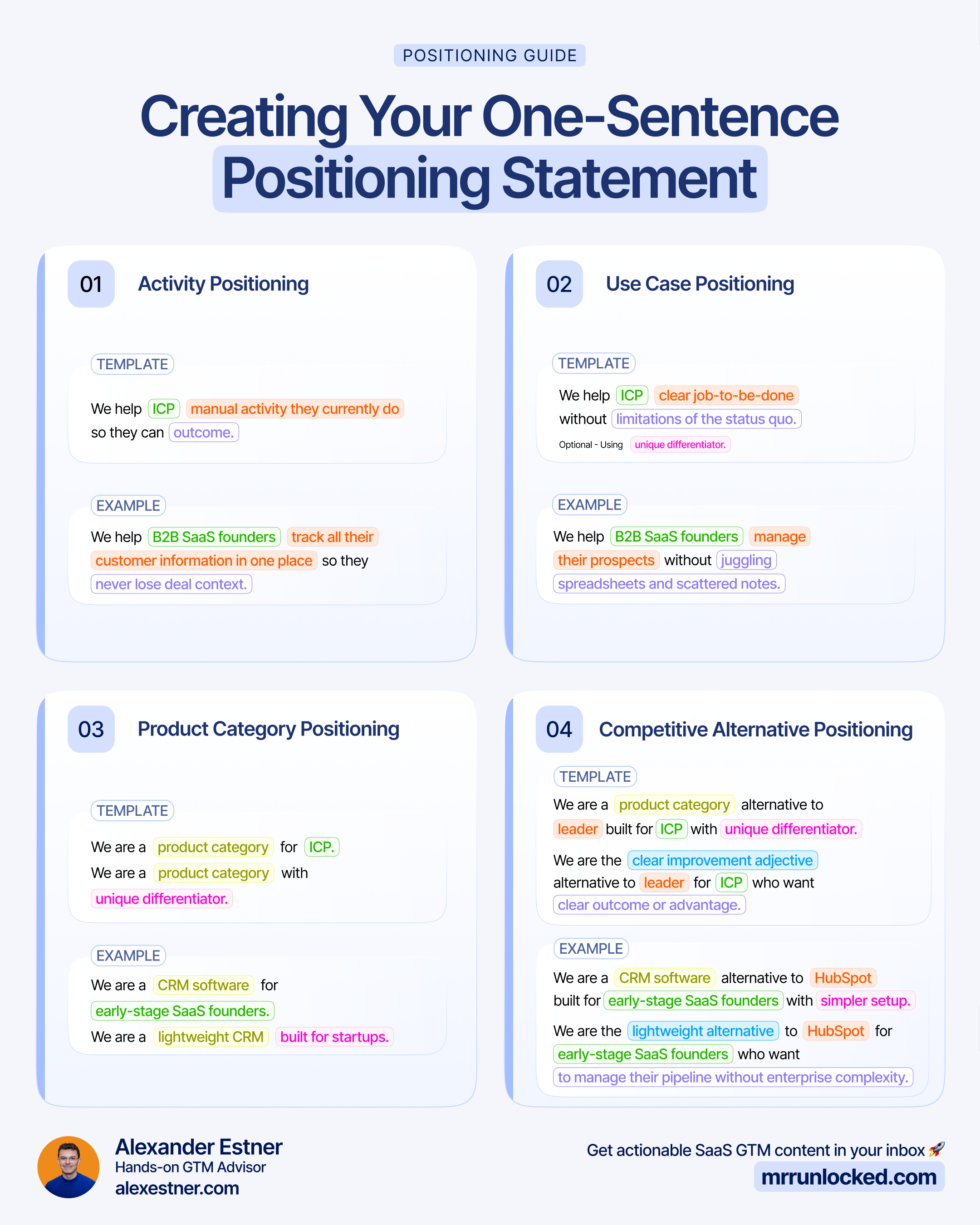 My positioning thinking is heavily influenced by April Dunford, Fletch PMM (with Anthony Pierri & Rob Kaminski), Rob Walling, combined with hands-on work with 30+ SaaS founders.